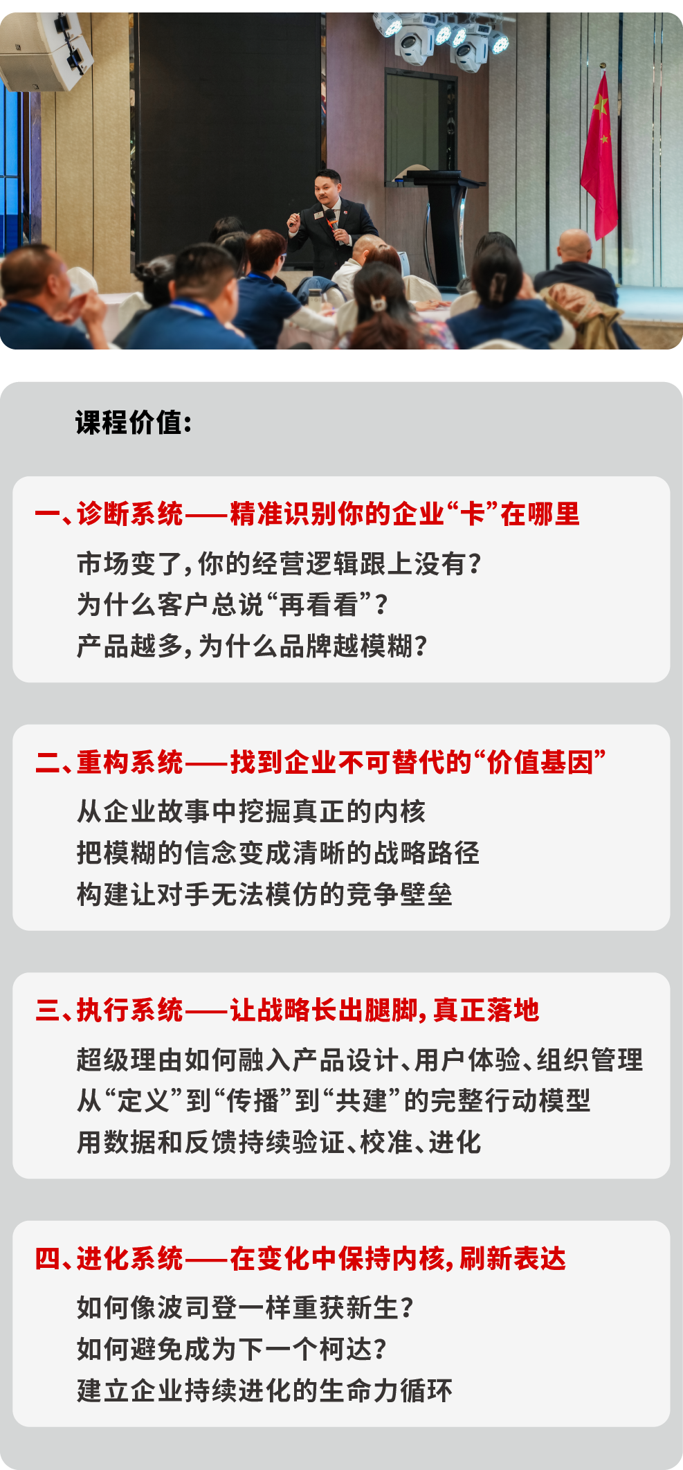 本课程以《孙子兵法》“先胜而后求战” 为思想内核,提出 “超级理由” 战略系统 —— 帮助企业先构建不可替代的价值内核,再进入市场竞争。